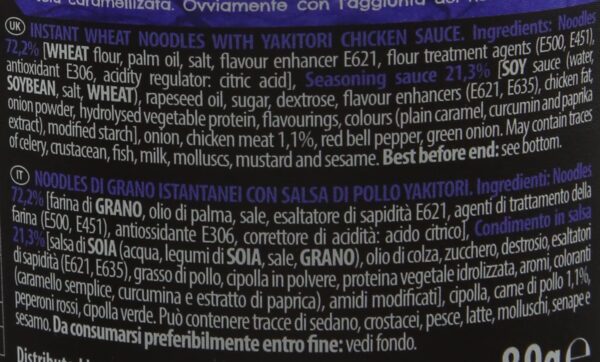Noodles 72, 2% [Wheat Flour, Palm Oil, Salt, Flavour Enhancer E621, Flour Treatment Agents (E500, E451), Antioxidant E306, Acidity Regulator: Citric Acid], Seasoning Sauce 21, 3% [Soy Sauce (Water, Soybean, Salt, Wheat), Rapeseed Oil, Sugar, Dextrose, Flavour Enhancers (E621, E635), Chicken Fat, Onion Powder, Hydrolysed Vegetable Protein, Flavourings, Colours (Plain Caramel, Curcumin and Paprika Extract), Modified Starch], Onion, Chicken meat 1, 1%, Red Bell Pepper, Green Onion